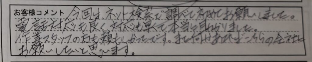 「今回は、ネット検索で調べ初めてお願いしました。電話対応も良く、対応も早くて本当に助かりました。作業スタッフの方も頼もしかったです。また何かあればこちらの会社にお願いしたいと思います。」