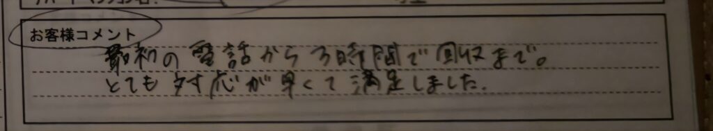 「最初の電話から3時間で回収までとても対応が早くて満足しました。」