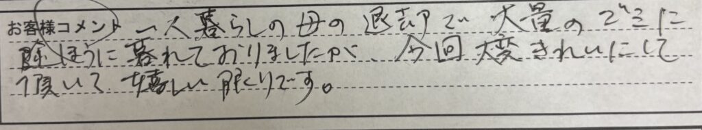 「一人暮らしの母の退去で大量のごみ処分に途方に暮れておりましたが、今回大変きれいにして頂いて、嬉しい限りです。」