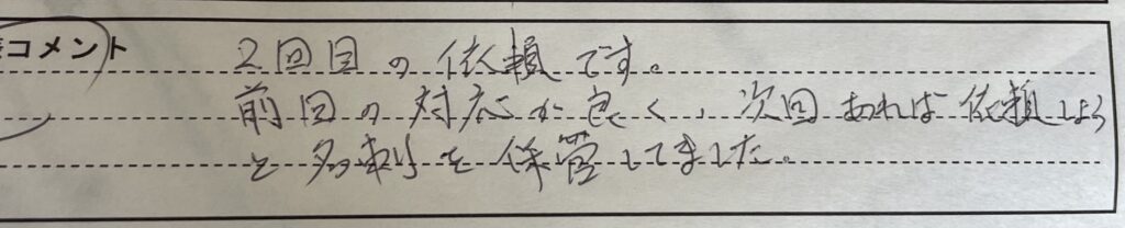 【2回目の依頼でです。前回の対応が良く、次回あれば依頼しようと名刺を保管してました。】
