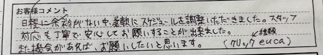 対応も丁寧で安心してお願いすることが出来ました。また機会があれば、お願いしたいと思います。】