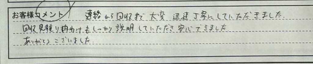 「連絡から回収まで大変 迅速丁寧にしていただきました。
